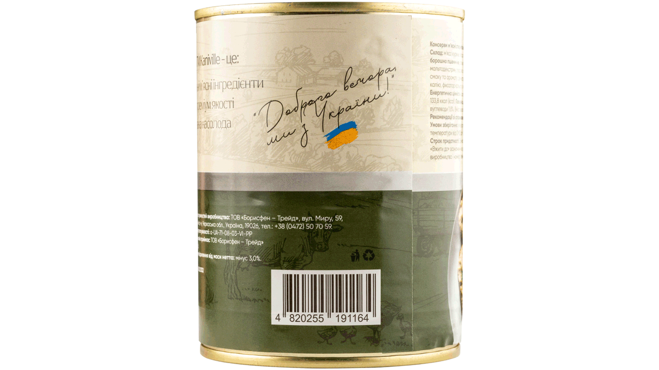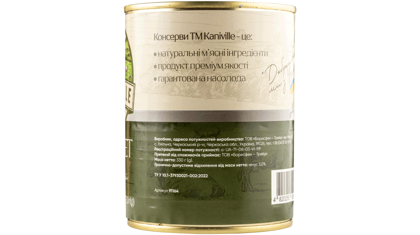 - пакуванню мʼясних консервів ТМ Kaniville у металеві банки з жерсті, яка на 100% переробляється, що гарантує довгострокове зберігання готового продукту без втрати його смакових властивостей.